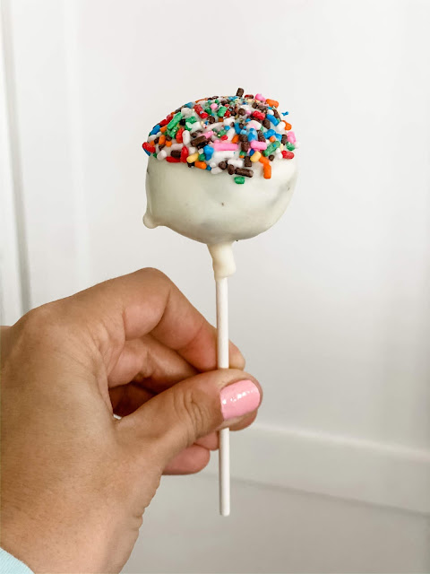 Make boxed cake according to box. I made them a dozen using half of the cake. Whether you made a boxed cake or bought a store bought one, the next steps are the same. Break the cake up and add in frosting. Using a fork keep mashing the cake with the frosting. I used about half of a container of frosting. But use as much until you feel as though you would be able to roll the cake into balls. Form balls by rolling in your hands and put stick halfway into ball. Place on a baking sheet and put into freezer for about an hour. Melt chocolate and dip cake pop in. Cover the stick a little as well, so that it doesn't fall off. To let them dry, I cut holes in the cake box, however I made them pretty big, so they were top heavy. I had my assistant (Joey) hold some until dried. We added sprinkles but you don't have to.